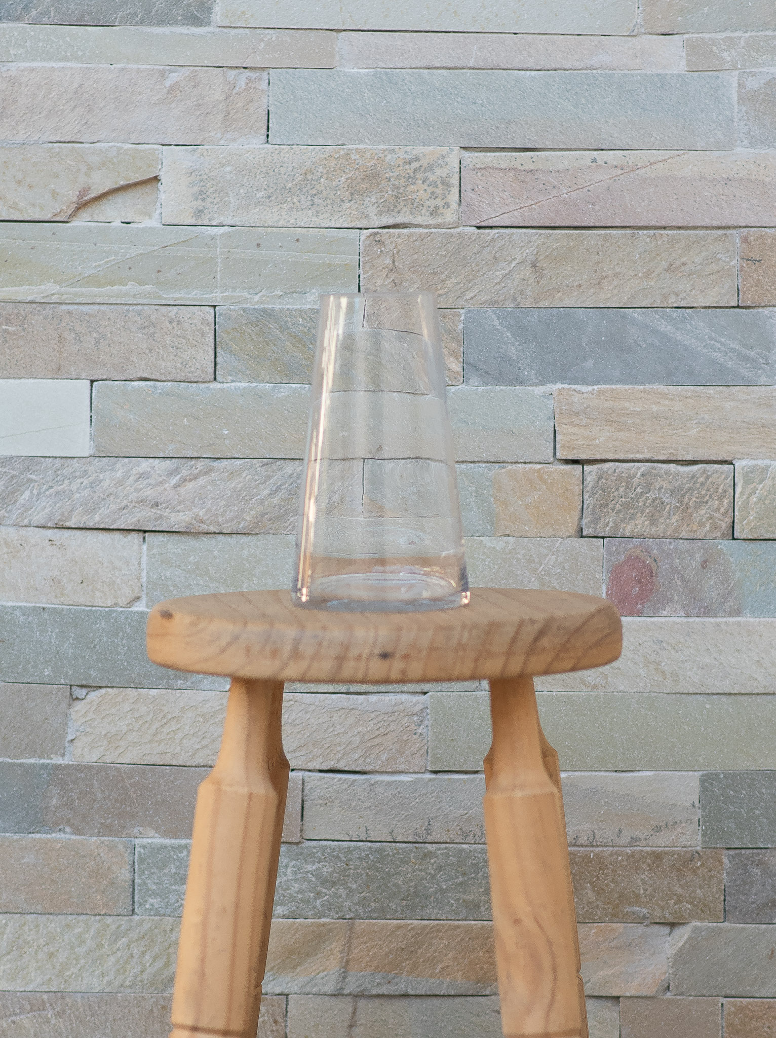 Florero de vidrio de forma cónica de 19cm de alto, 6cm de boca y 8cm de base.