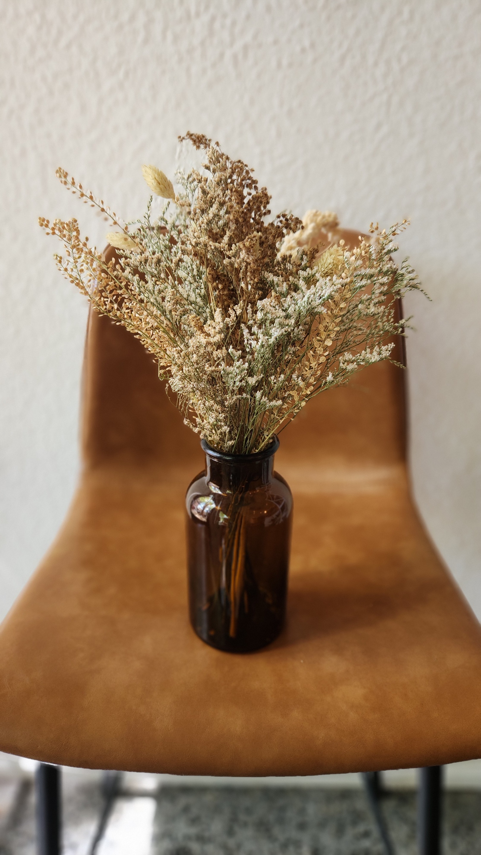 Box con un ramillete de flores y follajes secos, en tonos suaves en recipiente de vidrio color ambar de 17cm de alto, tipo boticario.