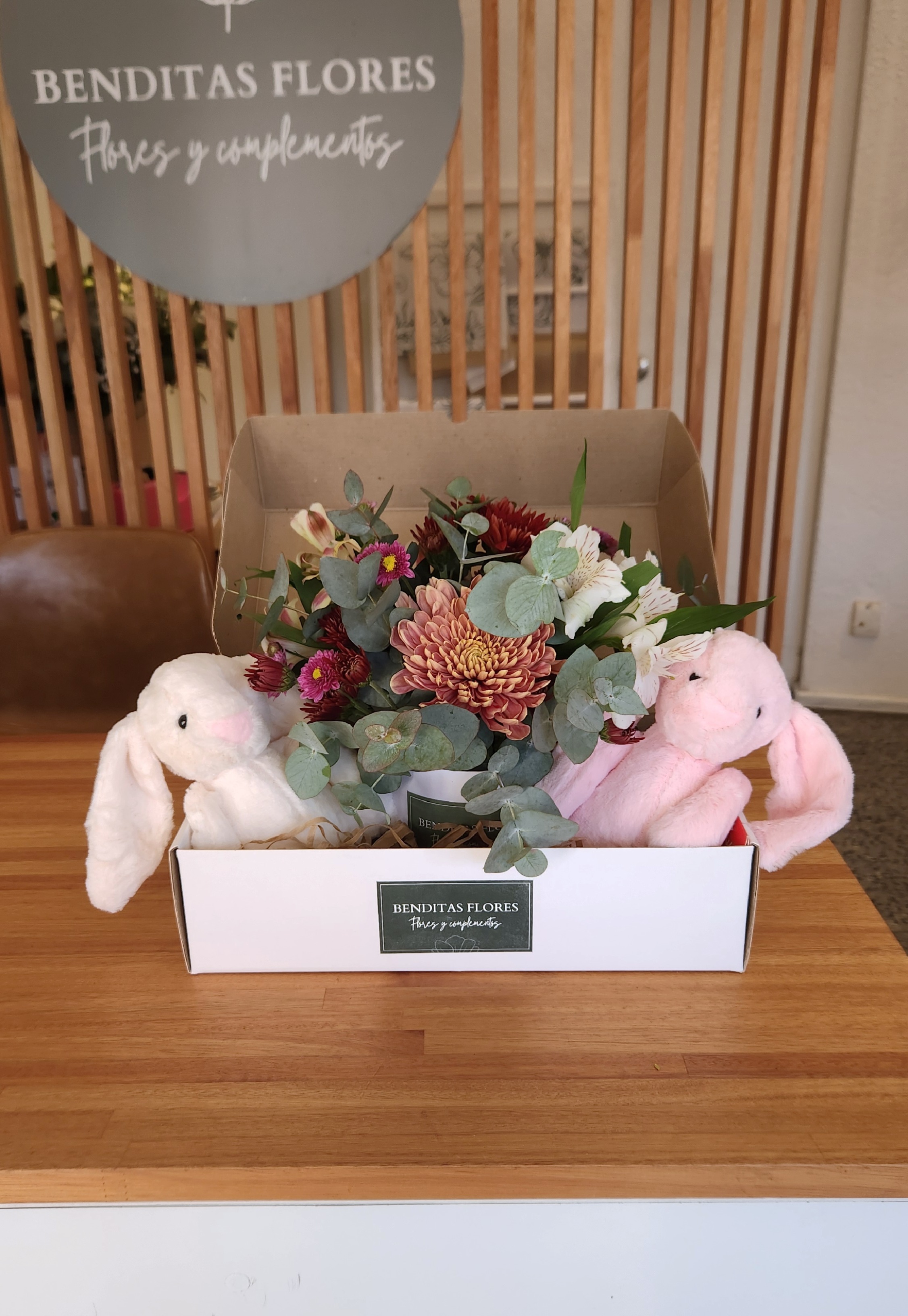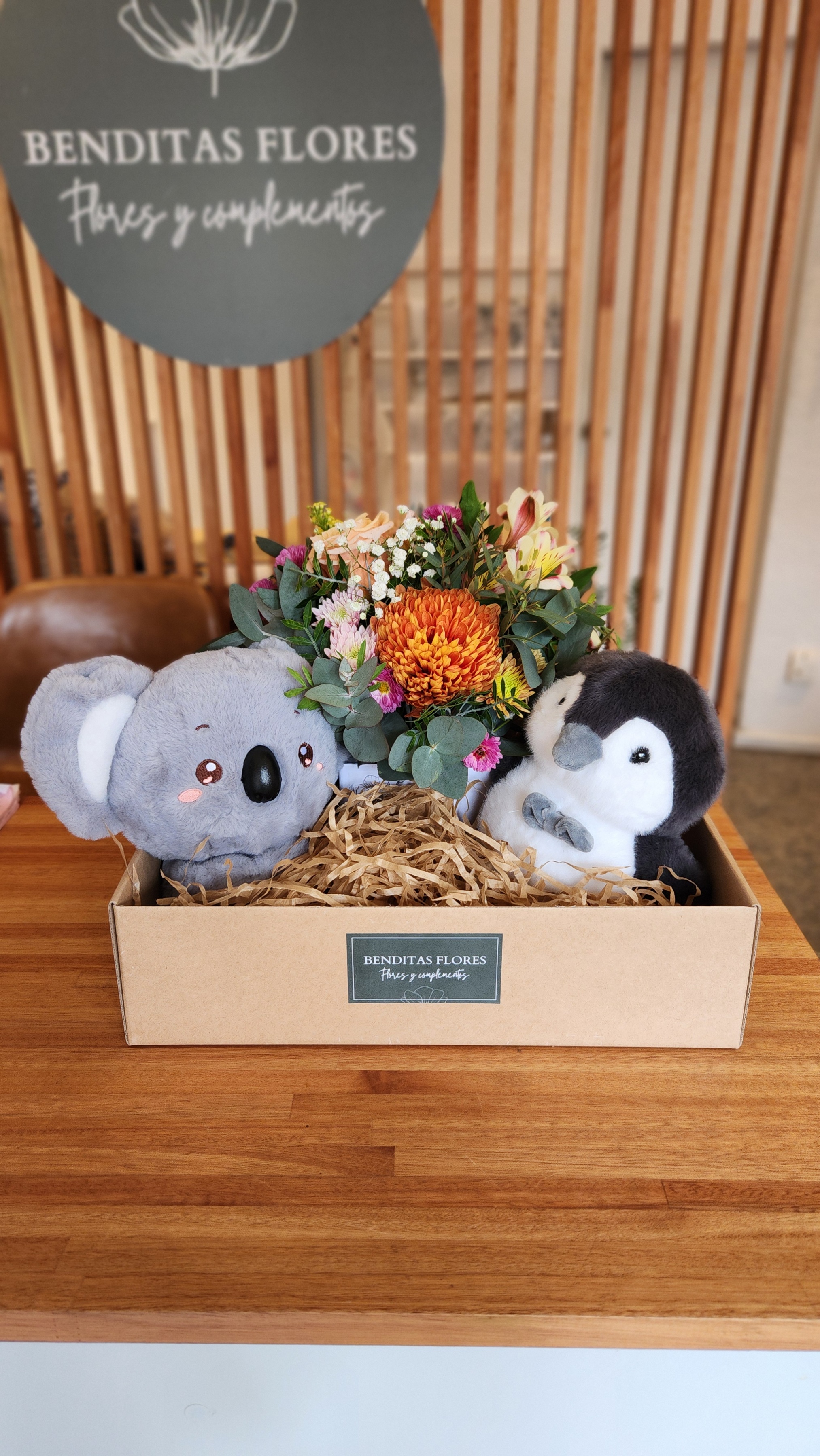 El canasta contiene un arreglo floral (en base) con flores variadas y follaje, acompañado de dos peluches de 20cm (según stock disponible) y tarjeta simple blanca para dedicatoria.