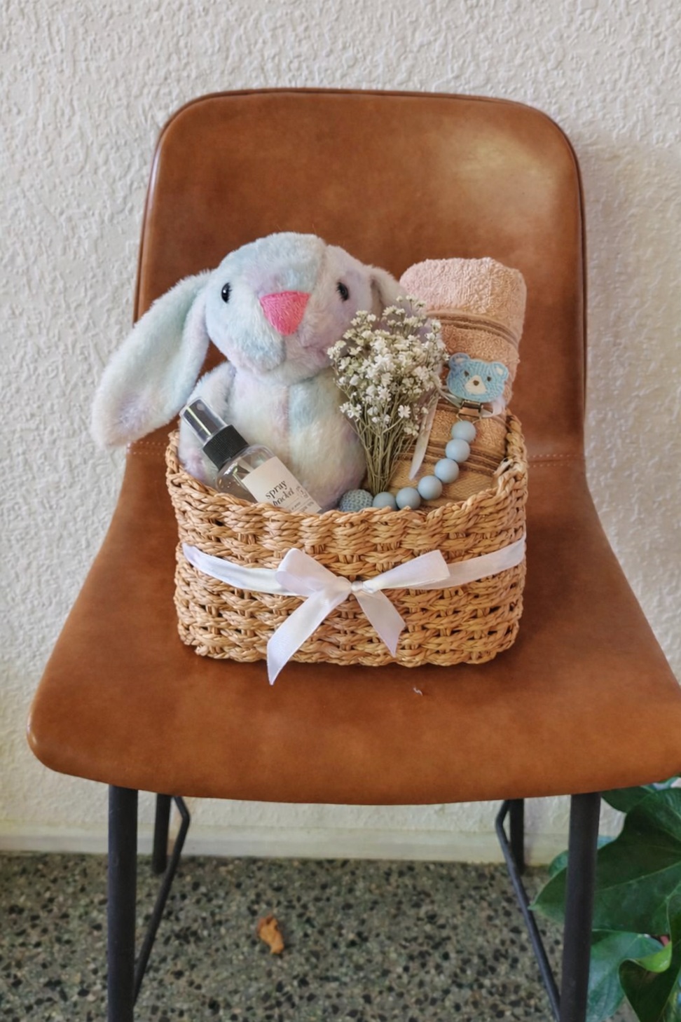 Canasto de fibra natural con lazo de raso en color blanco, en su interior contiene peluche chico, sujetador de chupete, mini ramito seco, toallita y spray textil pocket.