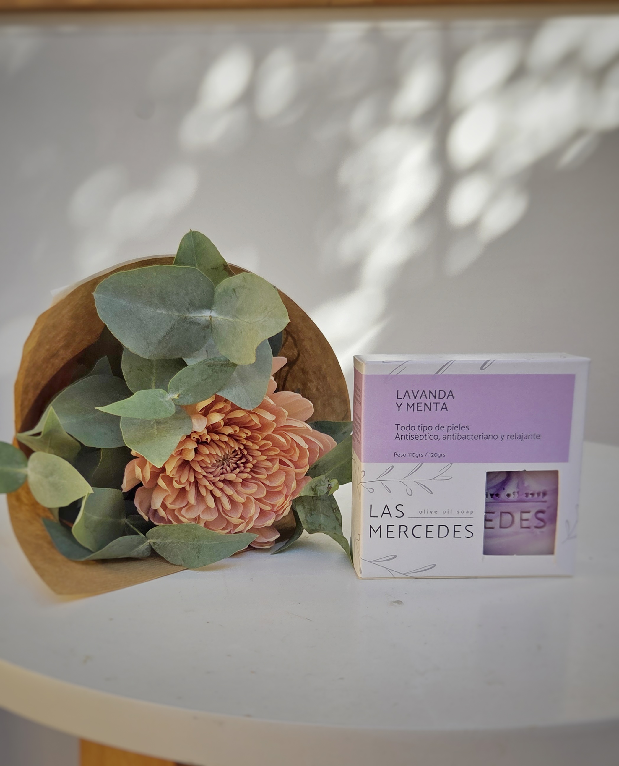 Cono simple con 1 vara de flor y follaje acompañado de 1 jabón de aceites naturales (fragancia a elección)