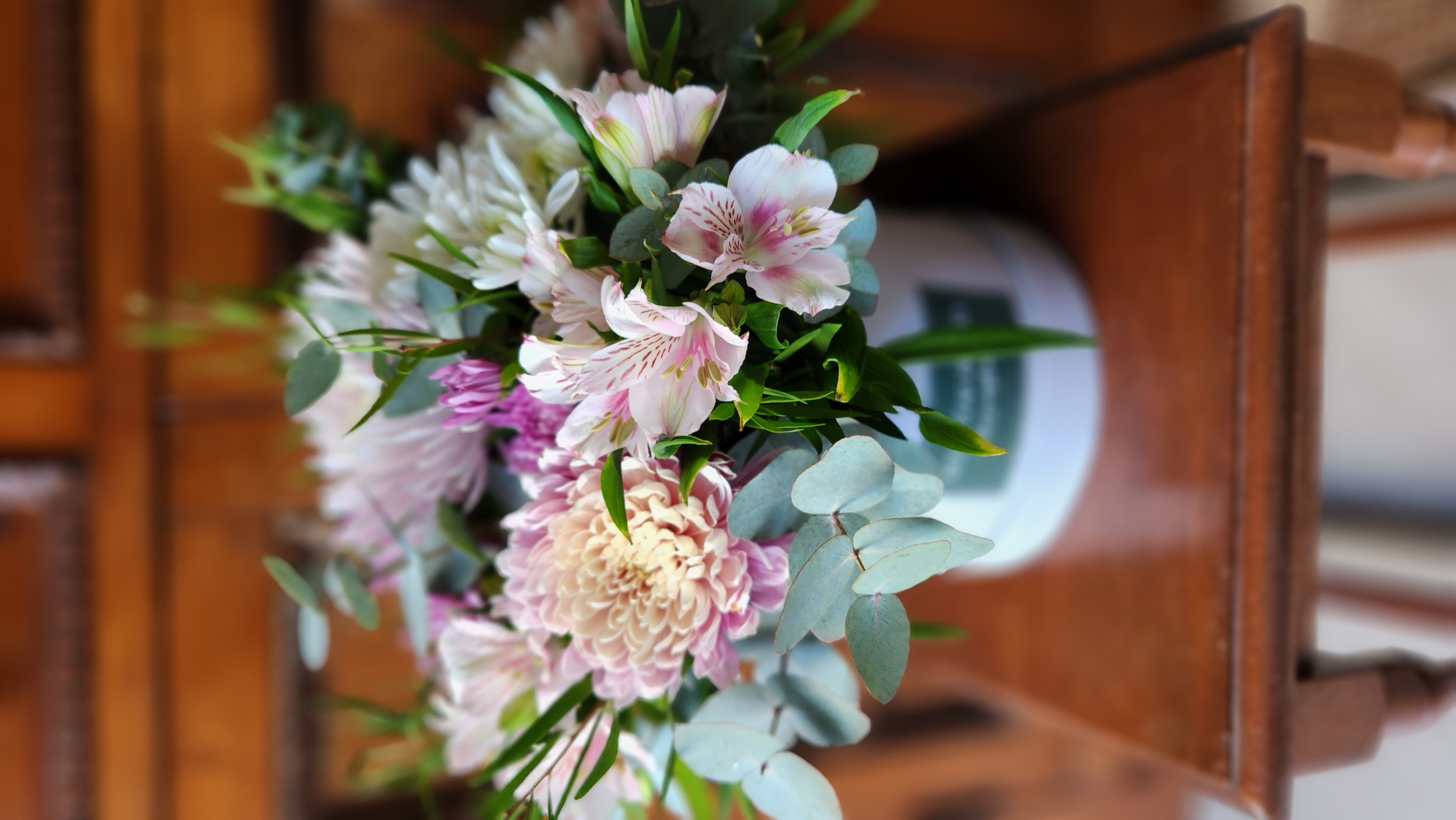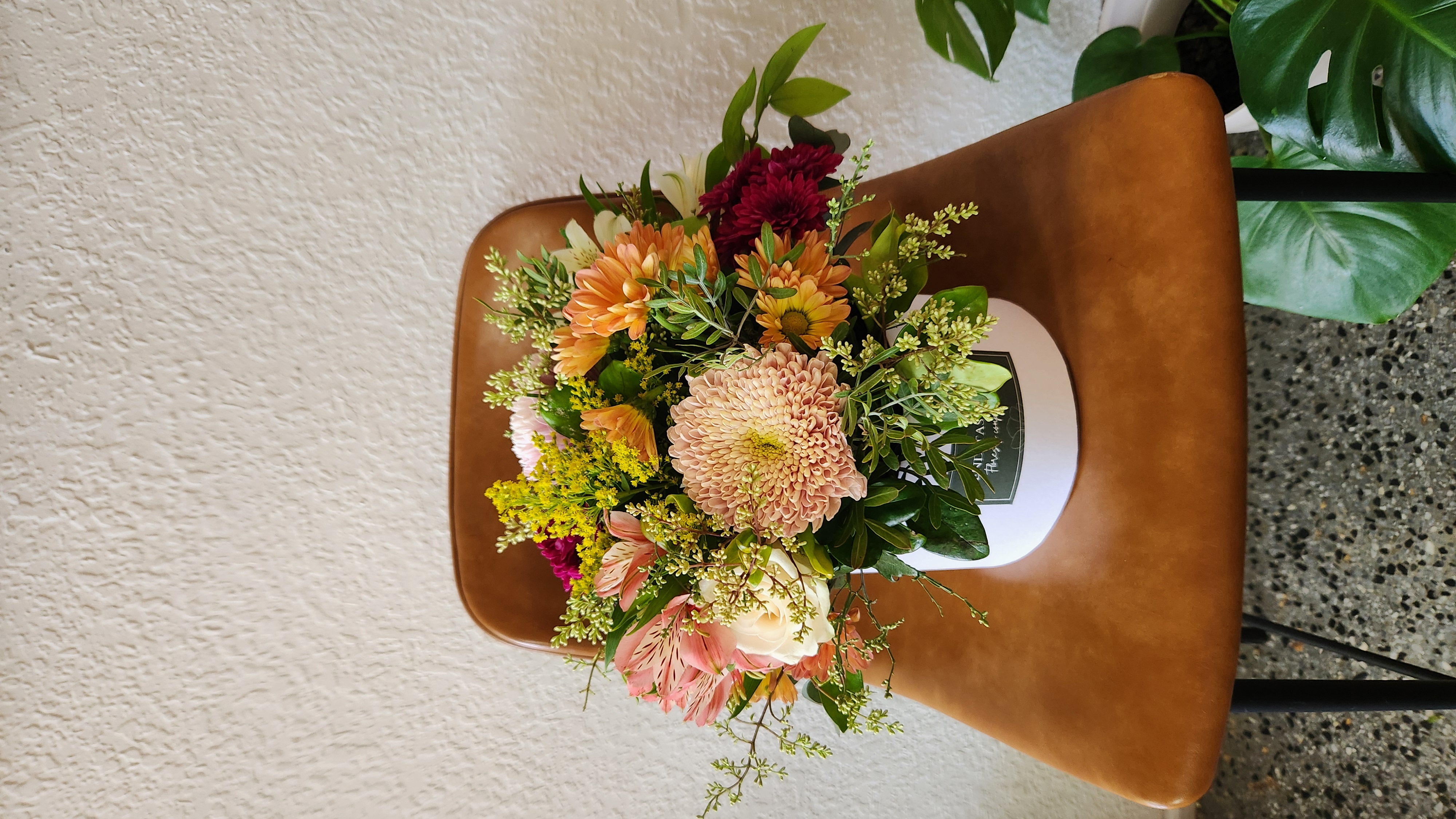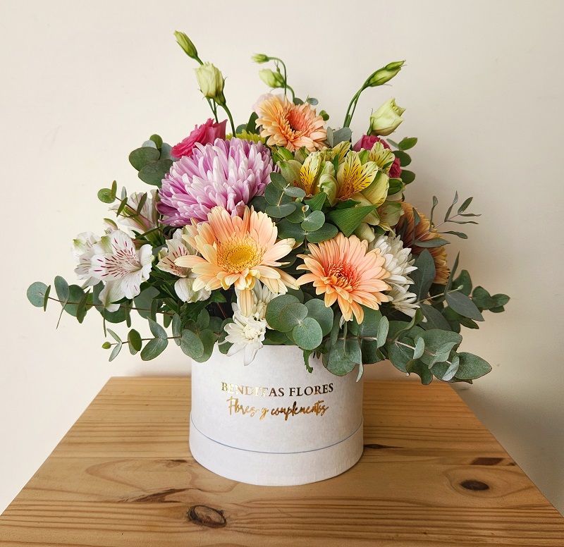 Arreglo de flores variadas y follajes en base de cartón rígido de 17cm de diámetro. Las flores a utilizar serán las sujetas a disponibilidad en el momento del armado y a criterio del diseñador.