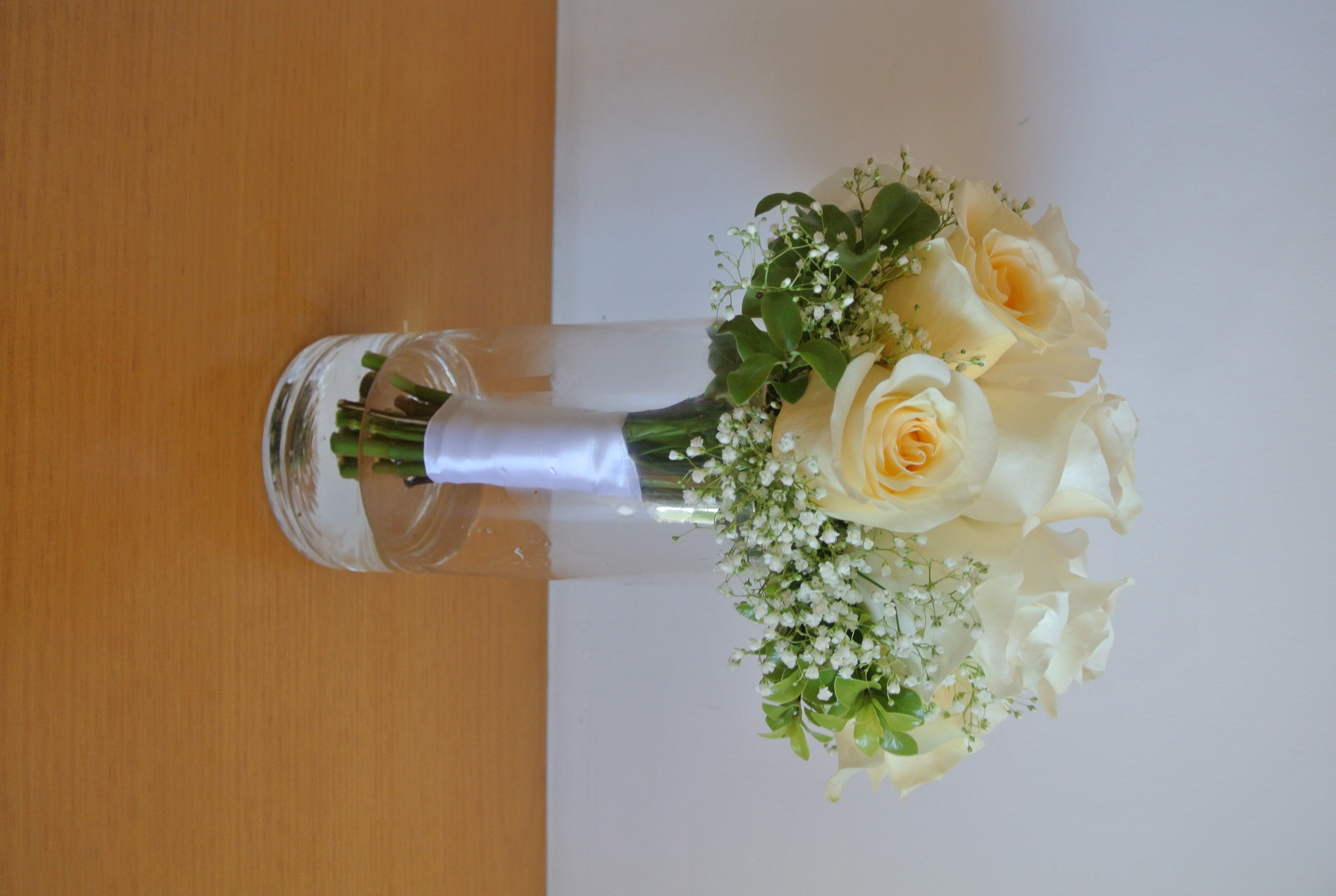 Ramo de novia en rosas en dos tonos con ilusión y detalle de cinta de raso blanca en los tallos.