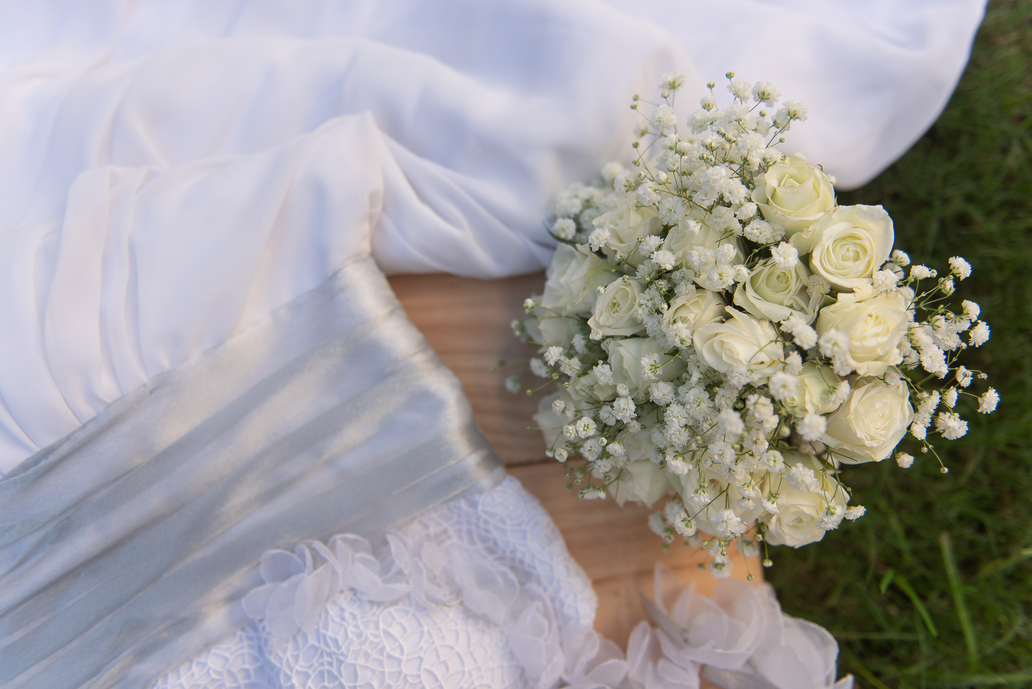 Ramo de novia en rosas en un tono con ilusión y detalle de cinta de raso blanca en los tallos.